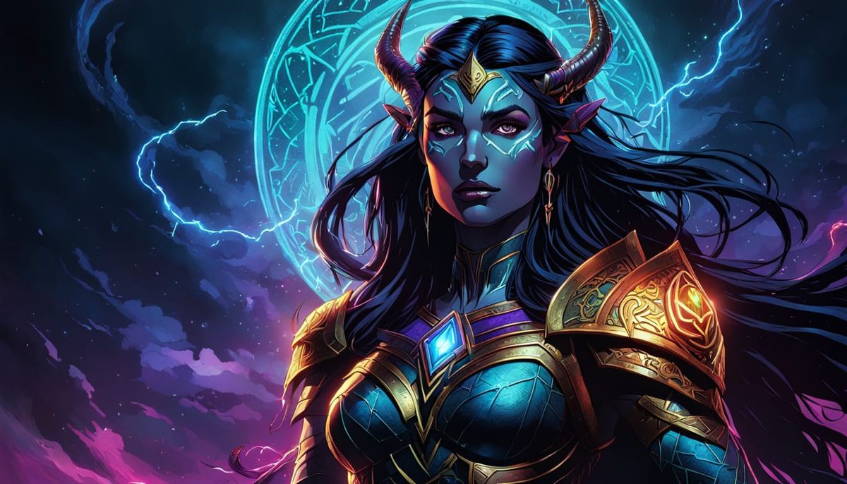 A comic book style close-up of the goddess Lucidia. She stands amid dark mist, illuminated by dynamic lighting and vibrant colors, with glowing runes and triadic colors in her hair. Soft gradient background.