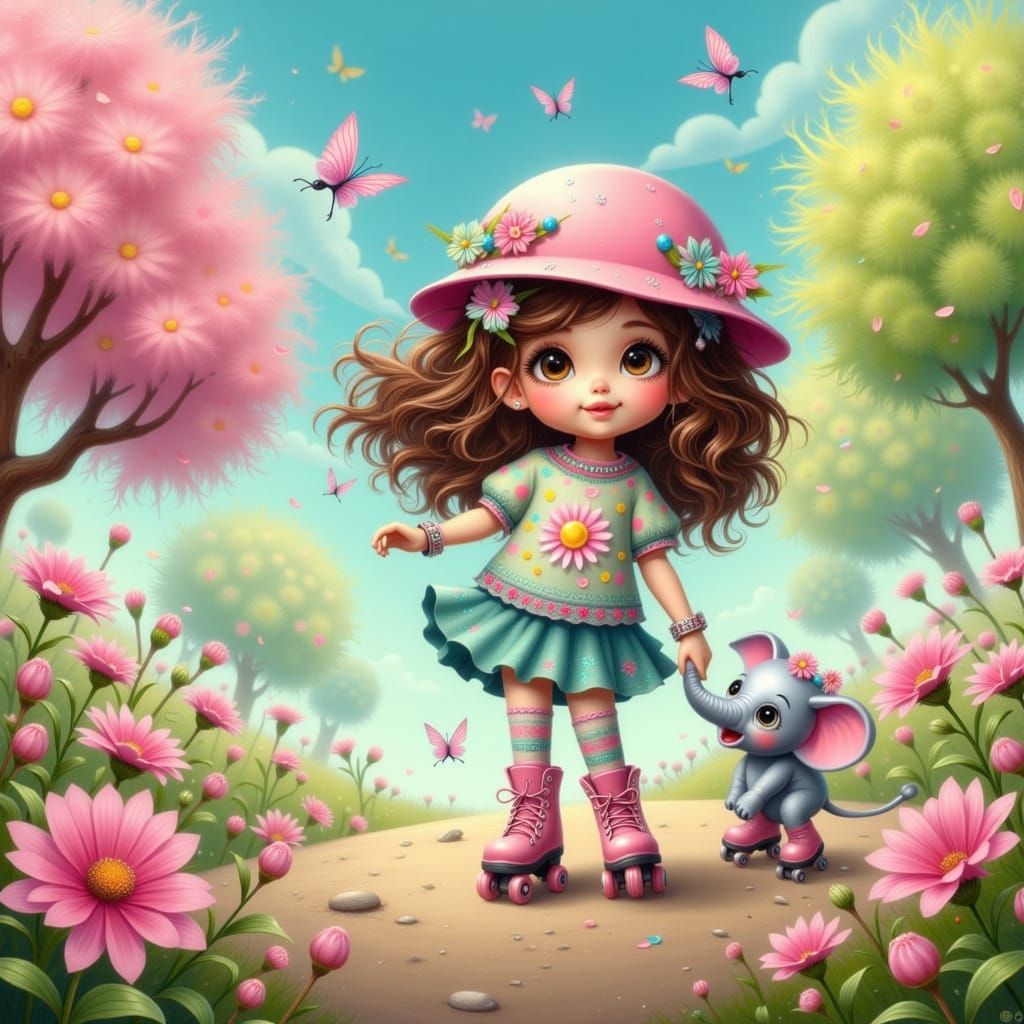 This vibrant illustration captures a sweet little girl and her best friend, a Teeny Tiny Fluffy Furry elephant, roller skating together in a sunny park filled with blooming flowers and lush green trees, in a style reminiscent of classic children's book illustrations with a hint of digital painterly flair...