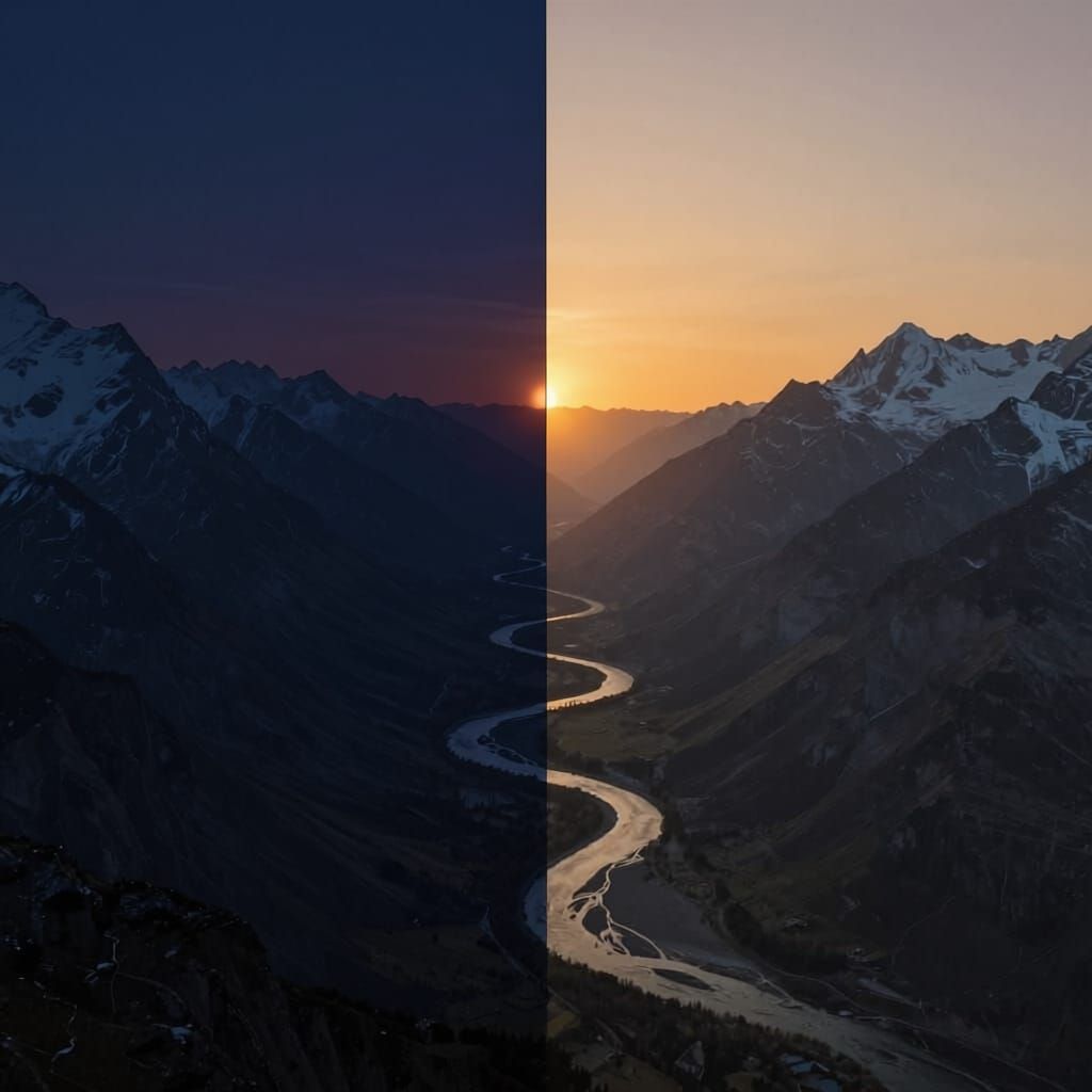 Half in sunset, depicting the end of a relationship, and the other half in sunrise, representing the second (successful) chance and a happy ending.
