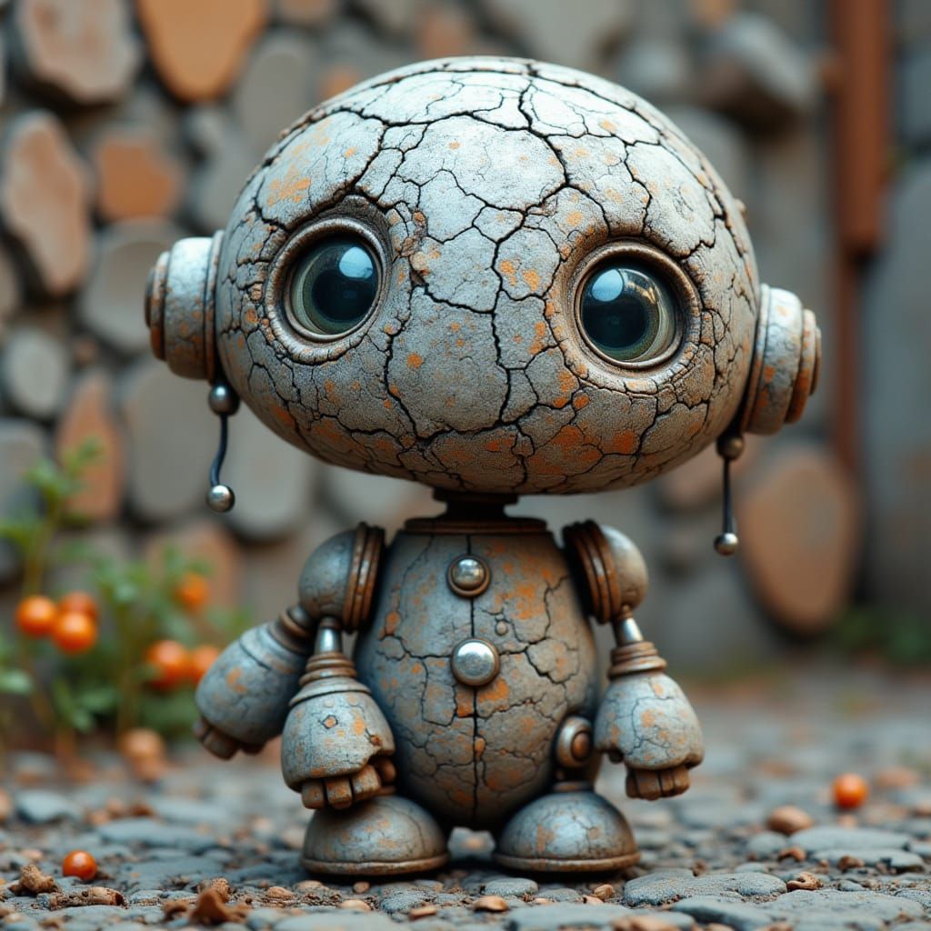 This image shows a charming patchwork robot with large, expressive eyes. Silver metal pieces and white details create a hyperrealistic photographic effect, making this a whimsical and captivating digital artwork.