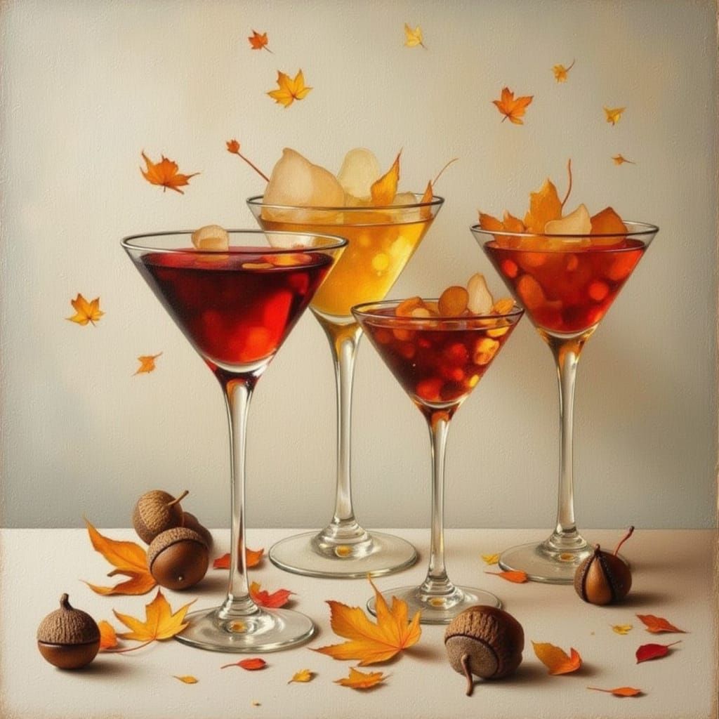 This image shows four elegant cocktail glasses filled with translucent sea glass pieces. Tiny acorns and pressed leaves create a playful autumn atmosphere. Soft, warm lighting highlights textures.