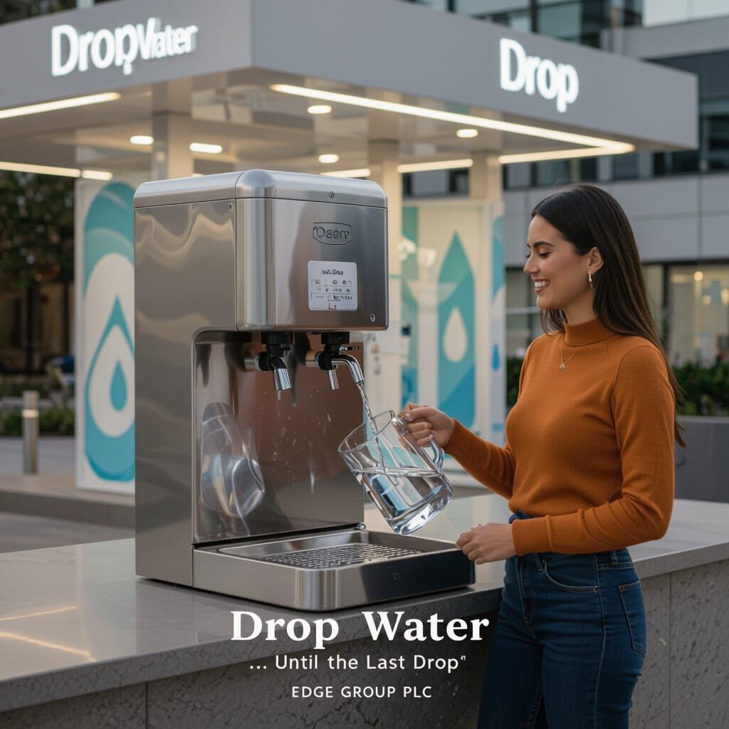 This commercial product photo features a gleaming stainless steel 'Drop Water' dispenser with push-lever taps and a sink. Photorealistic style with warm lighting.