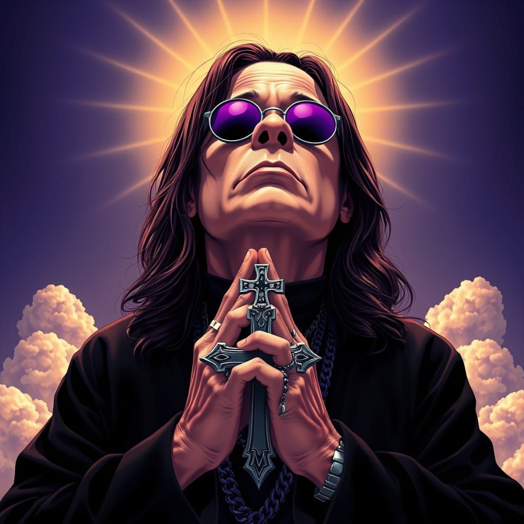 This image shows Ozzy Osbourne in a reverent pose, bathed in celestial light. The hyperrealistic image showcases intricate details and vibrant colors, reminiscent of classic 1980s anime.
