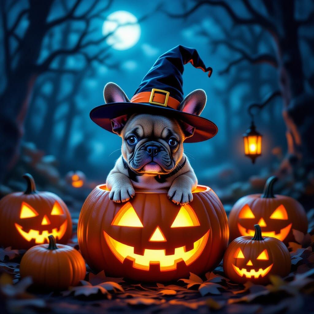 This image features an adorable French Bulldog puppy in a witch hat, nestled inside a glowing jack-o'-lantern. It's surrounded by spooky pumpkins on a mystical, moonlit Halloween night.