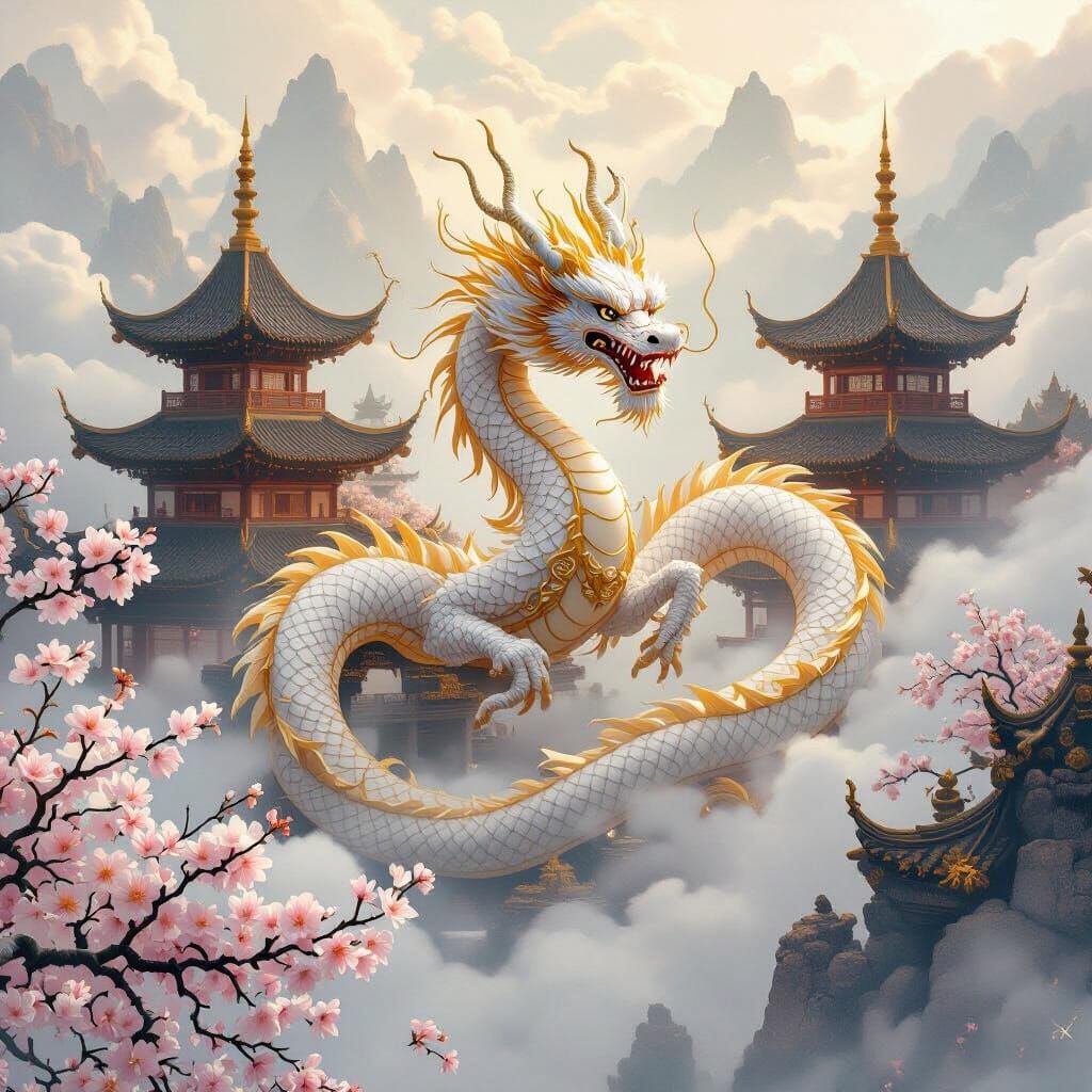This image shows a white and gold dragon soaring among pagoda temples in the clouds. Peach blossoms drift through the air, with soft lighting and intricate architectural details in a fantasy aesthetic.