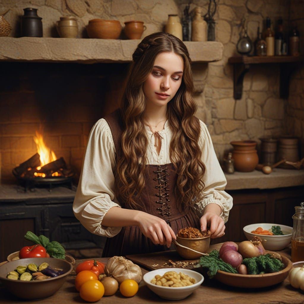 This image shows a medieval woman with long, curled brown hair preparing dinner in a cozy kitchen. The oil painting features warm colors, soft golden lighting, and earthy tones, with detailed brushstrokes.