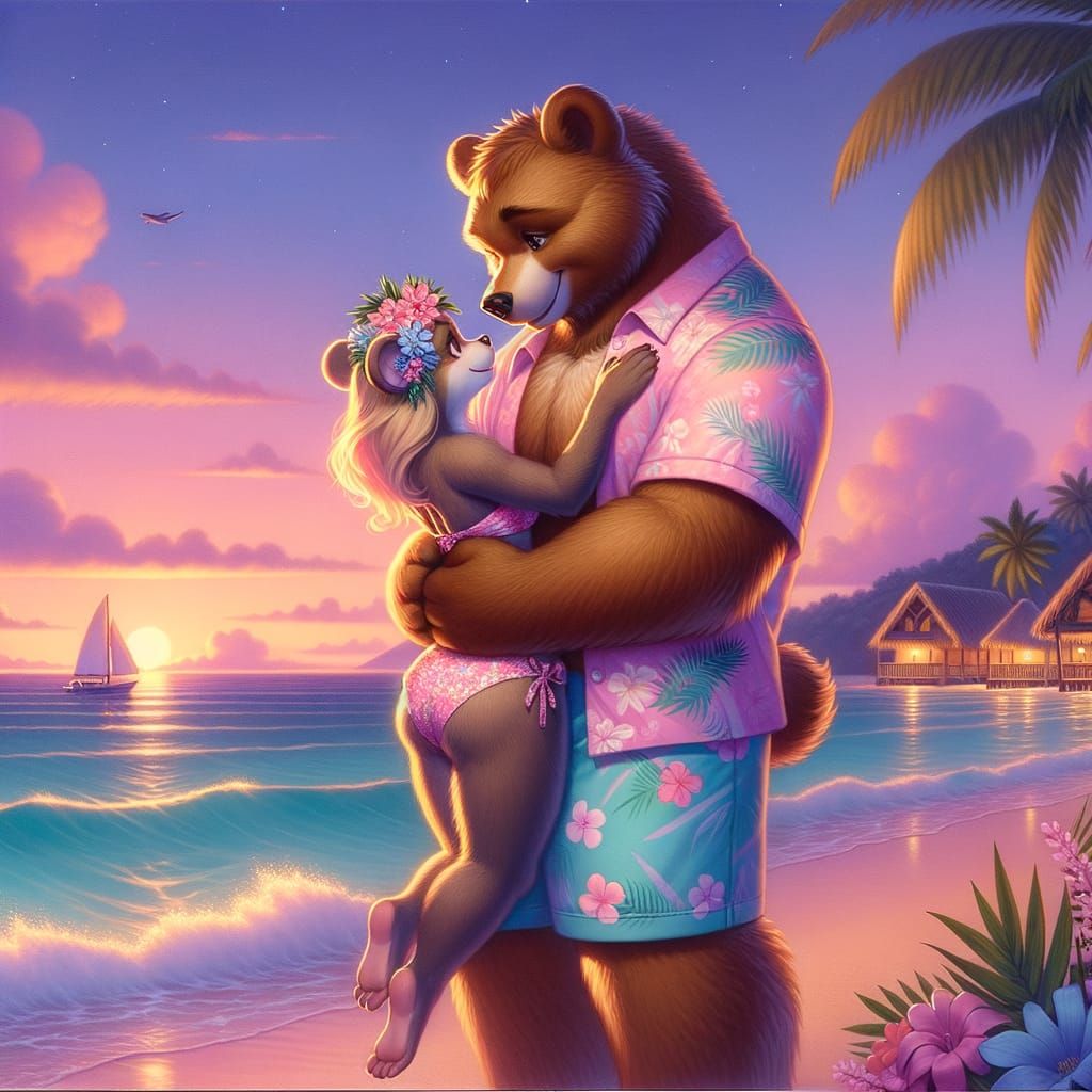 This image captures a tender moment between a bear and a mouse on a serene Caribbean beach at sunset. The bear, dressed in pastel Hawaiian attire, gently holds the mouse, adorned with a flower crown, as they gaze into each other's eyes. The atmosphere is idyllic, with palm trees swaying in the breeze and...