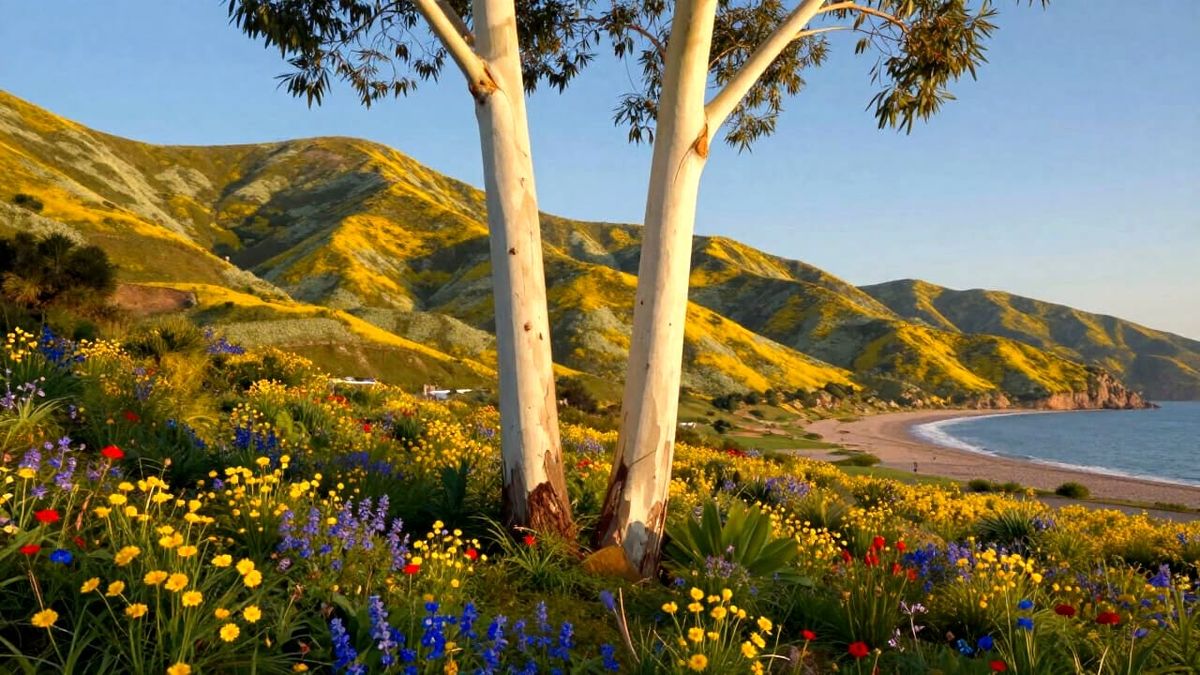 This AI-generated image features tall white eucalyptus trees in front of a mountain range covered in colorful flowers, with a seashore visible on the right under a blue sky.