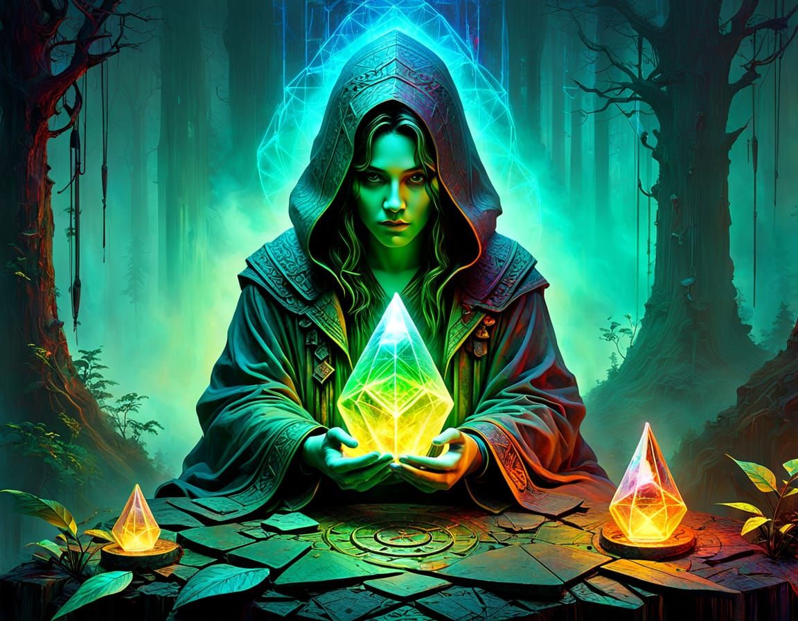 This image shows a cryptic sage at a misty crossroads holding a philosopher's stone. The artwork features scumbling techniques and neon-infused acrylics in a surreal style.