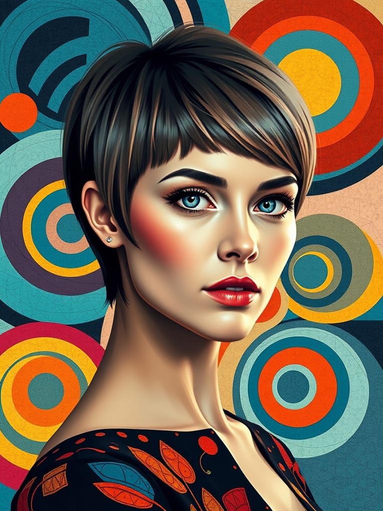 A vibrant image of a woman with short hair and blue eyes amidst colorful geometric shapes. The artwork features abstract patterns in a kaleidoscopic color palette, reminiscent of abstract expressionism.