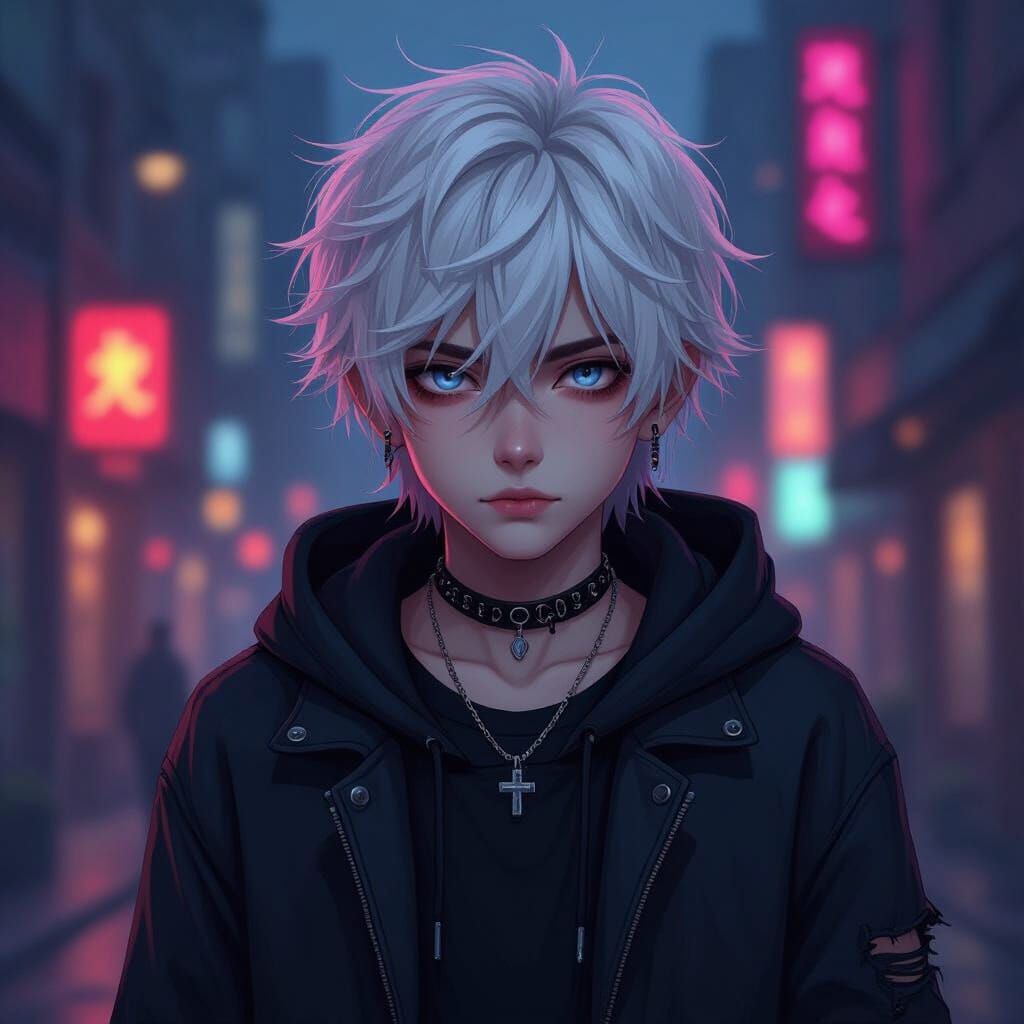 An anime-style illustration of a gothic teenage boy with white hair and pale skin, set against a neon-lit urban night. Features detailed character design and dramatic shading.