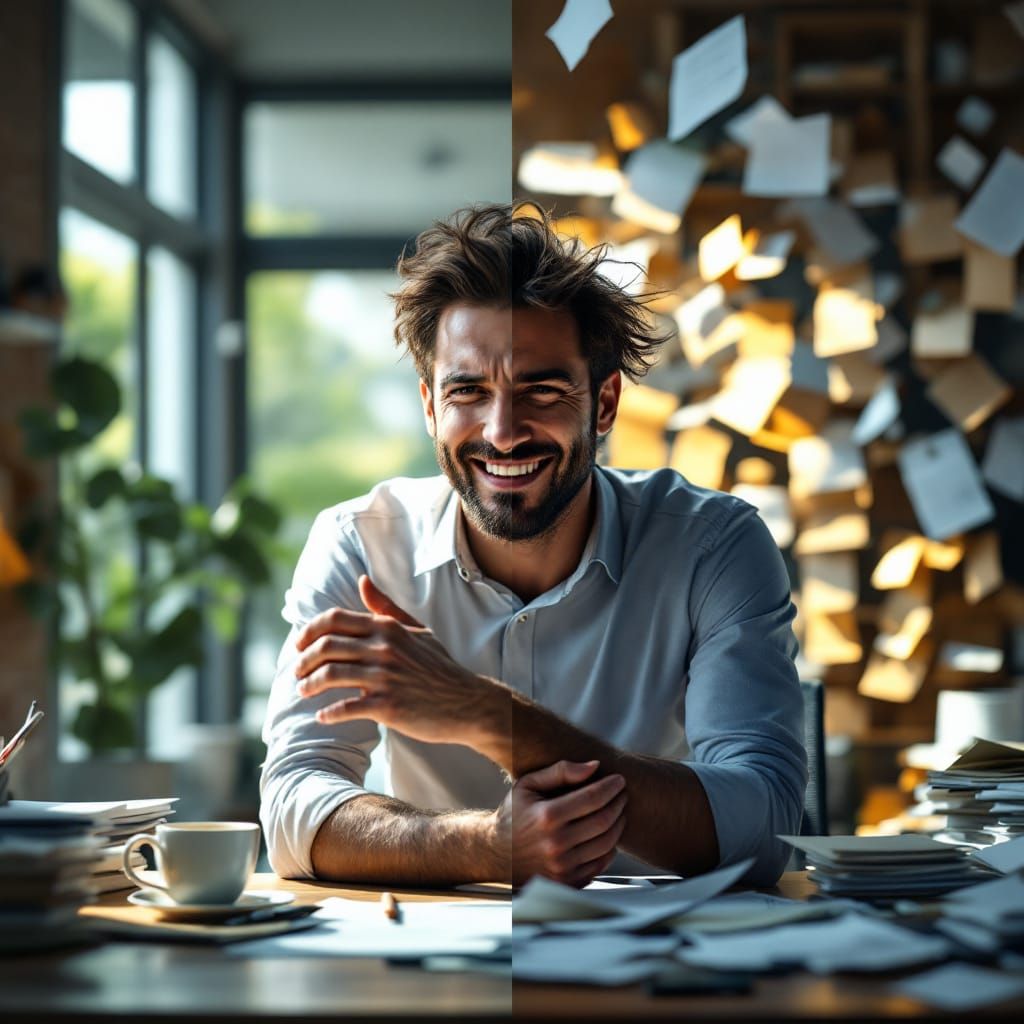 This photorealistic artwork contrasts a relaxed professional in a bright, organized office with a stressed individual in a chaotic, dimly lit workspace.