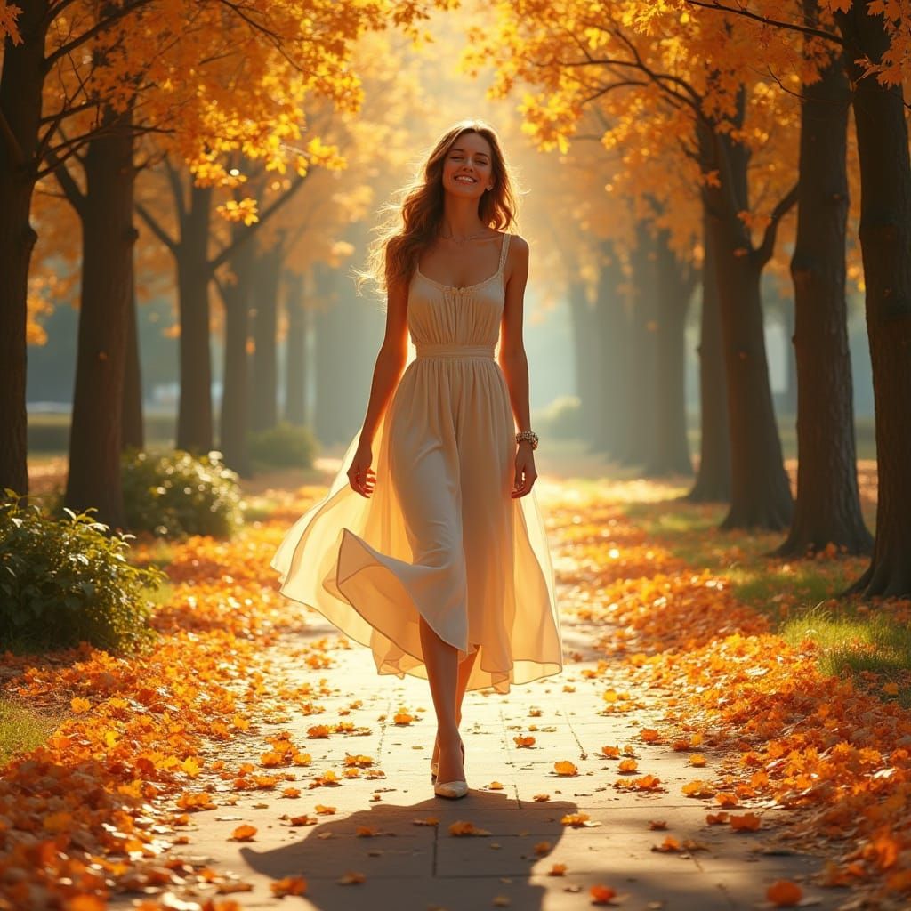A woman in an autumn-colored dress strolls down a leaf-strewn path. The scene captures the warm, dappled light of late afternoon, rendered in a soft, impressionistic style.