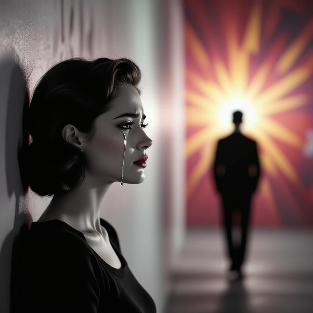 This image depicts a woman's isolation in stark black and white against a colorful backdrop, a single tear marking her sorrow. Cinematic lighting enhances the emotional contrast. Rendered with a shallow depth of field.