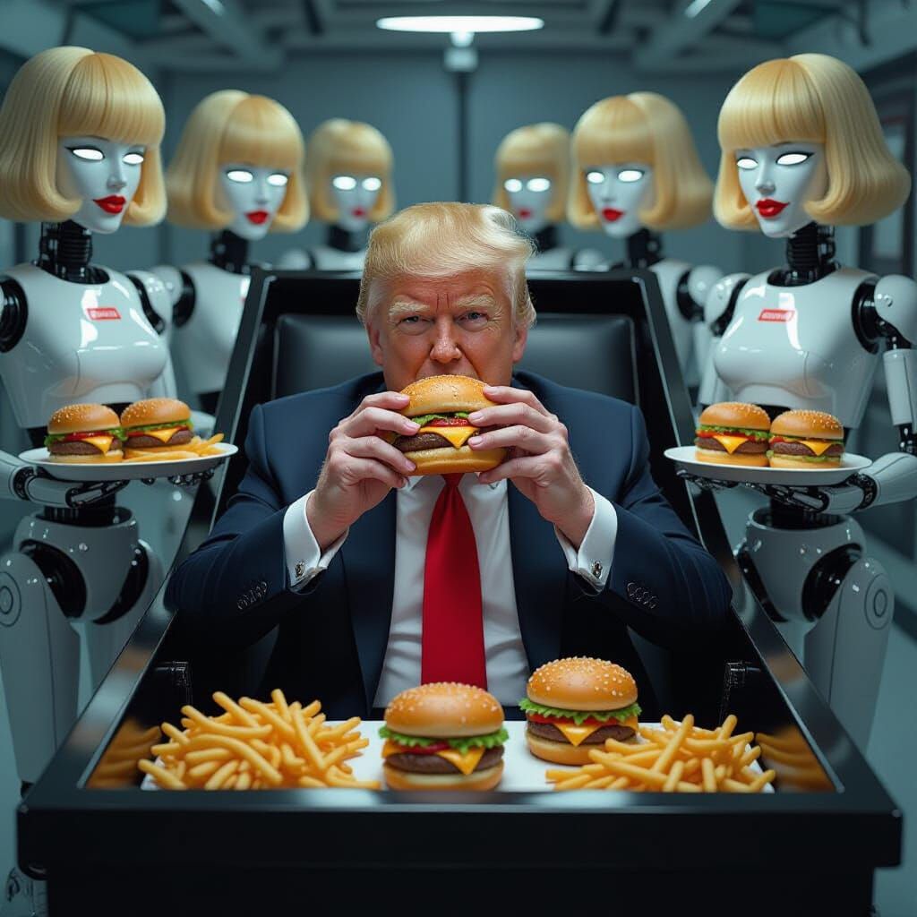 This image shows Donald Trump in a coffin, eating a cheeseburger. He is surrounded by robots with blond wigs, holding fast food. The artwork blends industrial and retro-futuristic elements.