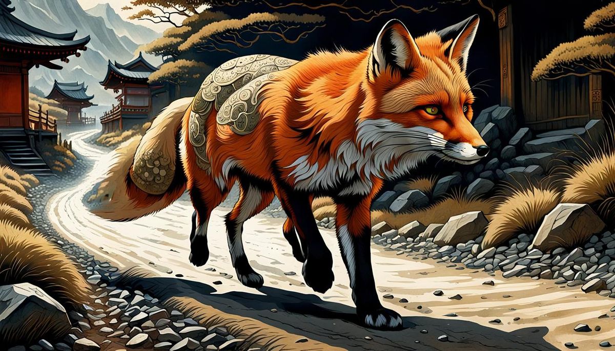 A beautiful Fox walking along a gravel path art print, in the style of kōji morimoto, neo-traditional japanese, john blanche, murals and wa...