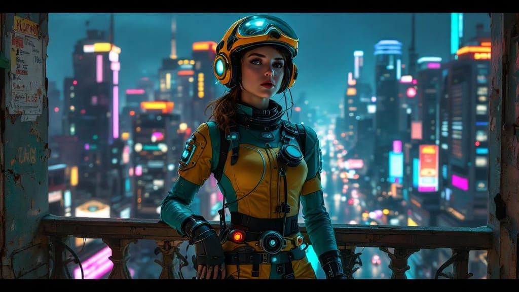 This image depicts a brilliant inventor, Felicity Fennigan, standing on a worn balcony overlooking a neon-lit metropolis, with a dark-teal and yellow jumpsuit and futuristic gadgets, conveying determination and curiosity, in a nostalgic and adventurous sci-fi art style.