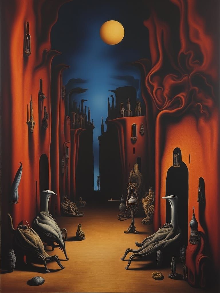 Hotel. Echo. Lima. Papa. RICHARD NO. Intensely surreal imagery and atmosphere, hypnagogia, psychosis, anxiety, quiet mental breakdown, a mixture of 20th century Surrealist influences, Rembrandt lighting, rich textures, oil on canvas. <lora:STRANGE WORLD:1.0> <lora:Sentinels:1.0>