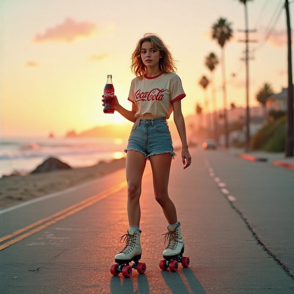 A 17-year-old girl roller skates down a California street at sunset, embodying a carefree surf vibe. Features 80s pastel colors, a nostalgic mood, and a soft grain texture.