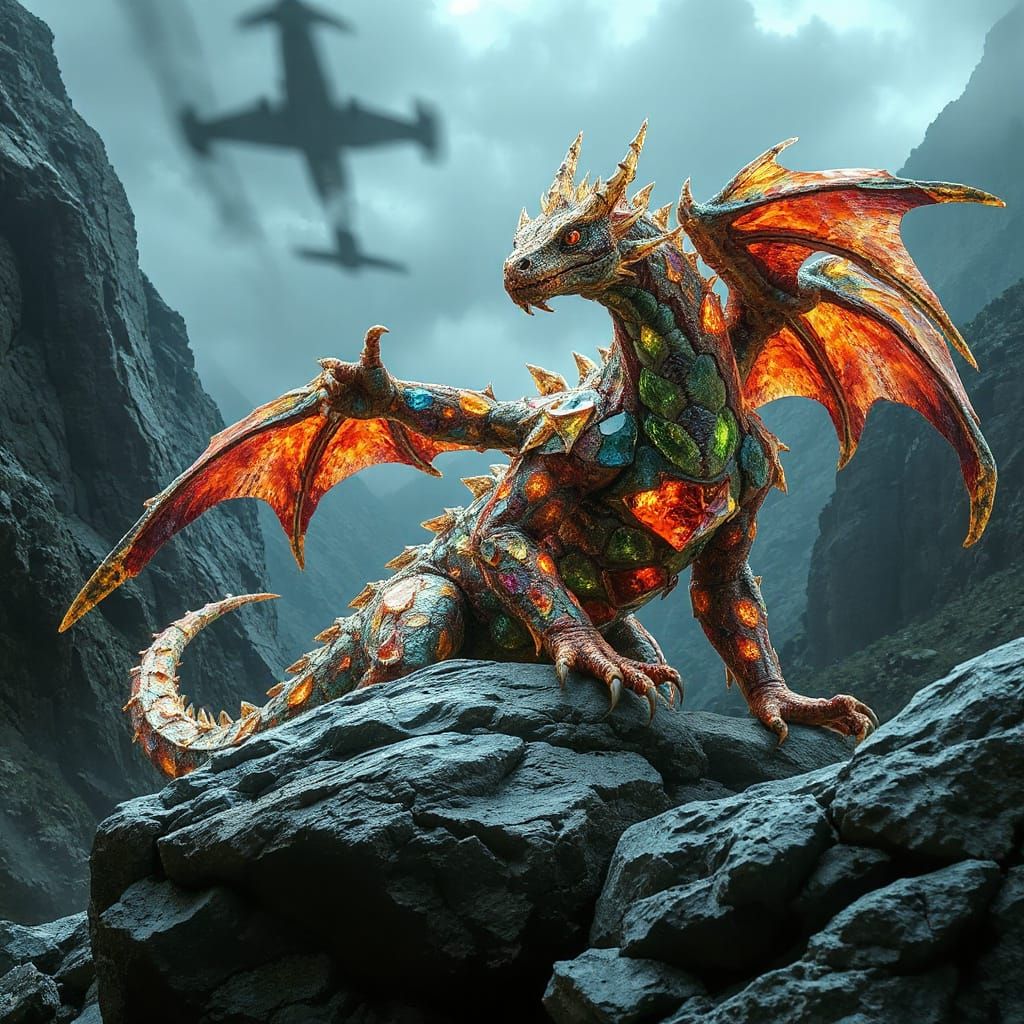 A majestic dragon made of sharp, colorful crystals surveys a valley from atop a massive rock. The dragon's body shimmers with gothic and cyberpunk elements.