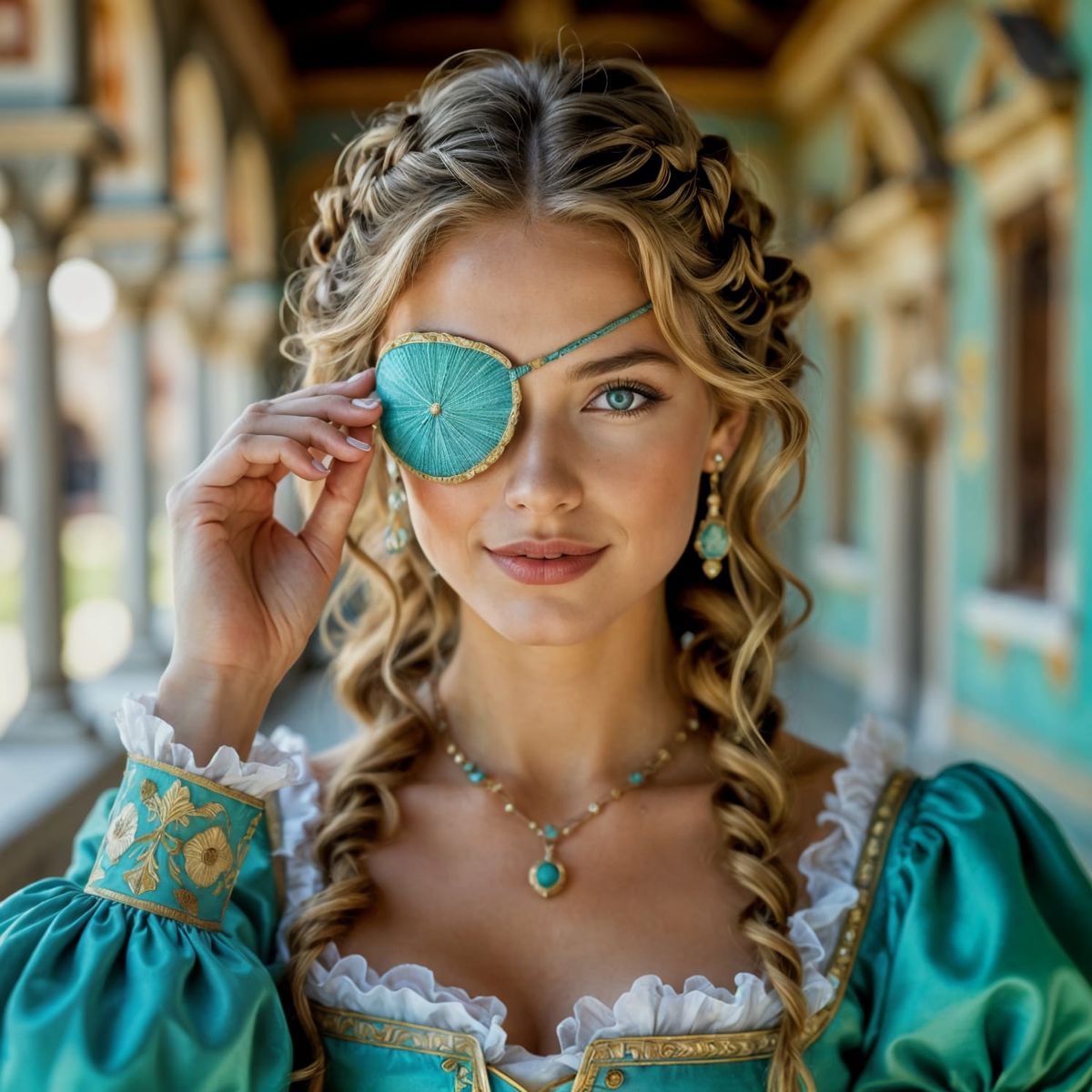 Fine art photo of a mischievous blonde woman in a turquoise Italian Renaissance dress, lifting her eyepatch in a Venetian palace. Captures a historical, vibrant atmosphere.