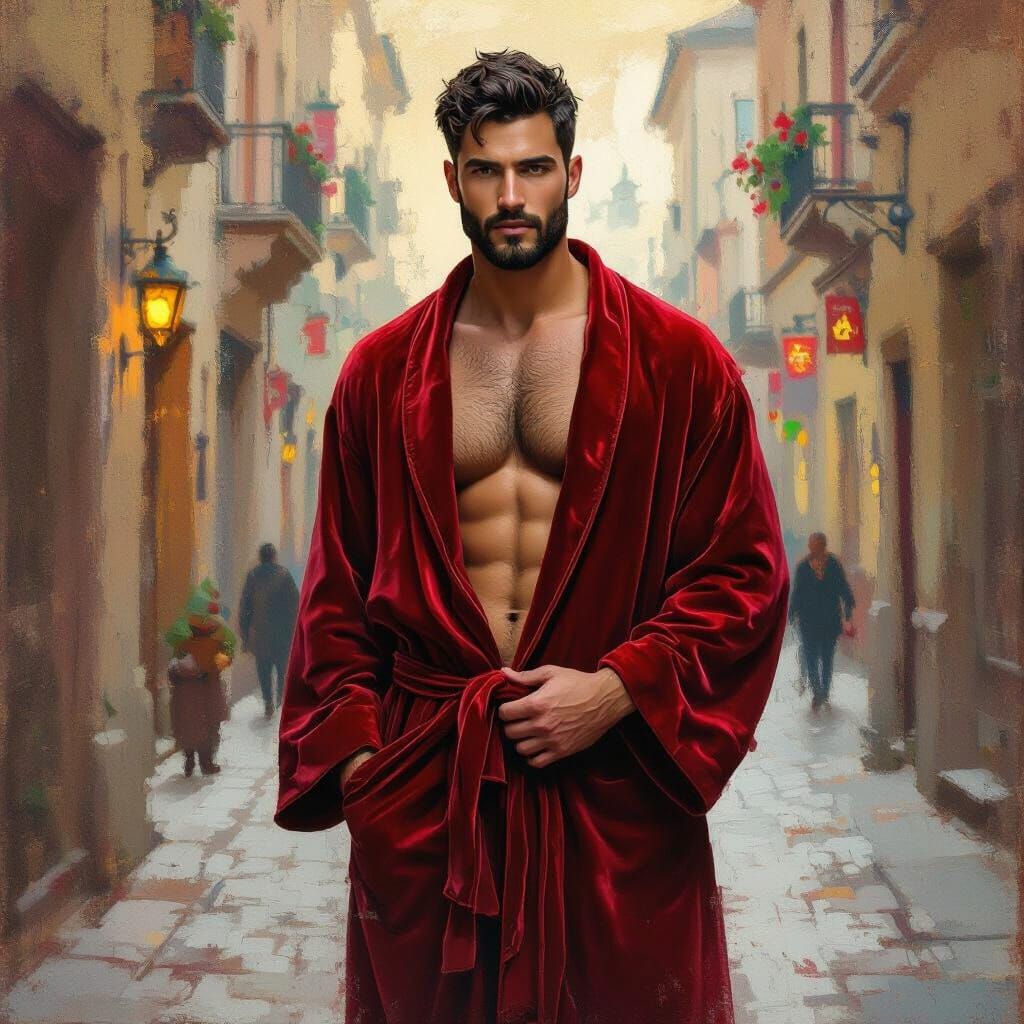 A striking picture of a handsome man with an open red robe in a city street. This image captures an impressionistic portrait with impasto oil techniques, textured paint layers, and warm, dynamic lighting.