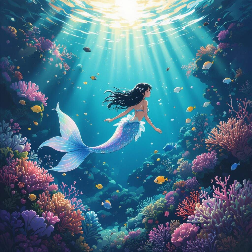 This image shows a mermaid swimming through a colorful underwater garden. Bioluminescent coral and exotic fish are illuminated by sunbeams in this dreamy, pastel-colored fantasy art.