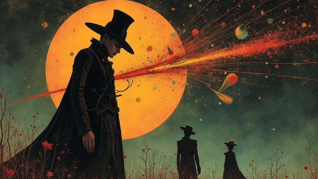 This striking image depicts a dark, surreal, and maximalist scene inspired by vintage illustrations and soviet iconography, evoking a sense of vintage science fiction.