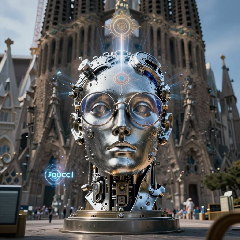 michelangelo painting style : antique statue head with futuristic glasses ,very connected spiritual, gaudi in background, portal open, third eye chakra, ray of lights between characters, floating noise, ultra deep contrast, large scene composition, letters hologram : Gaucci , bad argentic finish