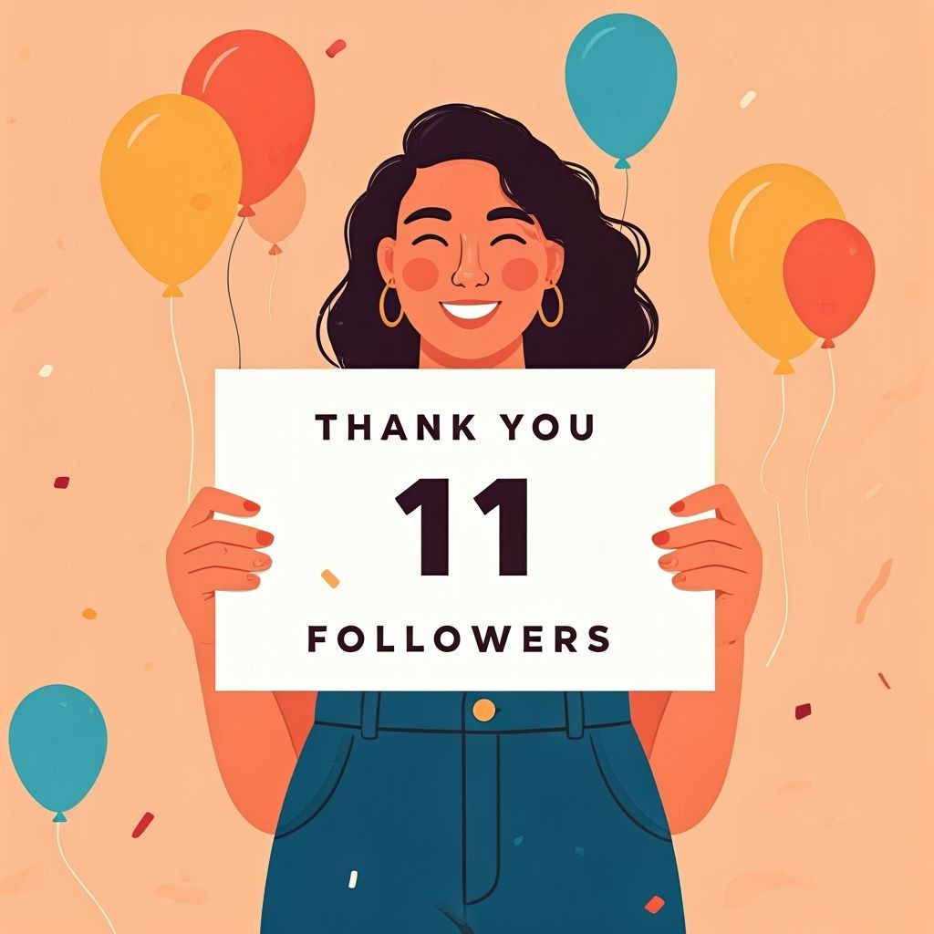 A joyful person celebrates 111 followers with a thank you sign, surrounded by festive balloons and confetti in a vibrant, playful artistic style.