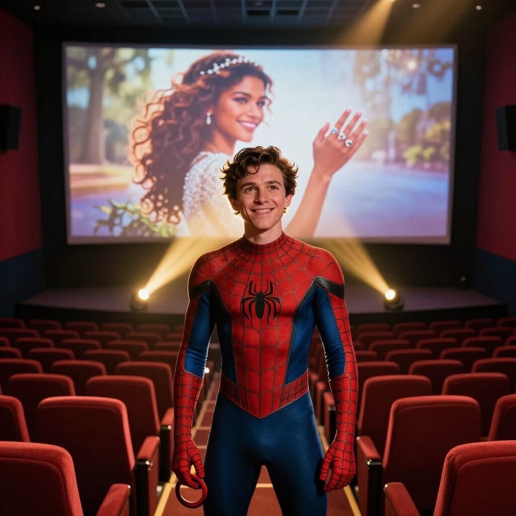 A cinematic image of Tom Holland as Spider-Man in a grand, empty cinema. Projector light illuminates him and a symbolic image of engagement on the screen.