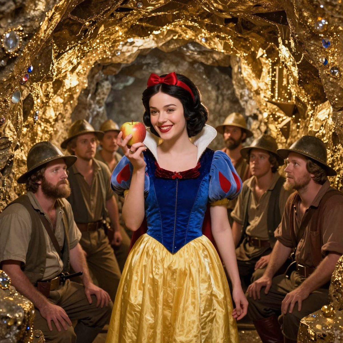 This image shows an adult Snow White holding an apple in a sparkling gold mine, surrounded by seven miners. Rendered in a realistic, cinematic style with 8K resolution.