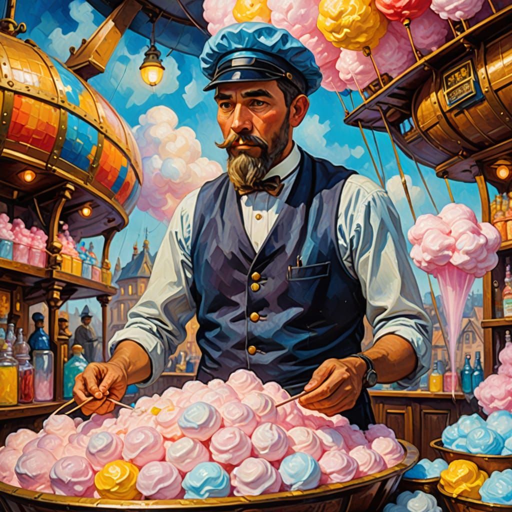 A vibrant neo-impressionist painting of a shopkeeper serving cotton candy aboard an airship. The image is textured with impasto techniques and features golden lighting in a post-impressionist style.