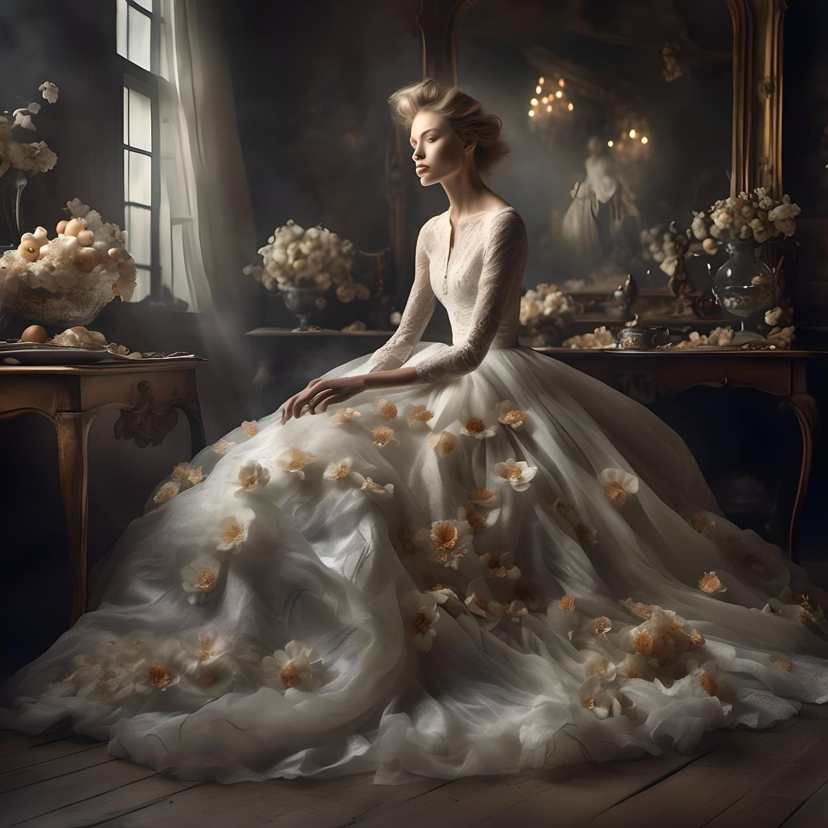 A hyperrealistic photograph of a woman in white. This fusion of photographic styles creates a striking HDR portrait with a double exposure effect.