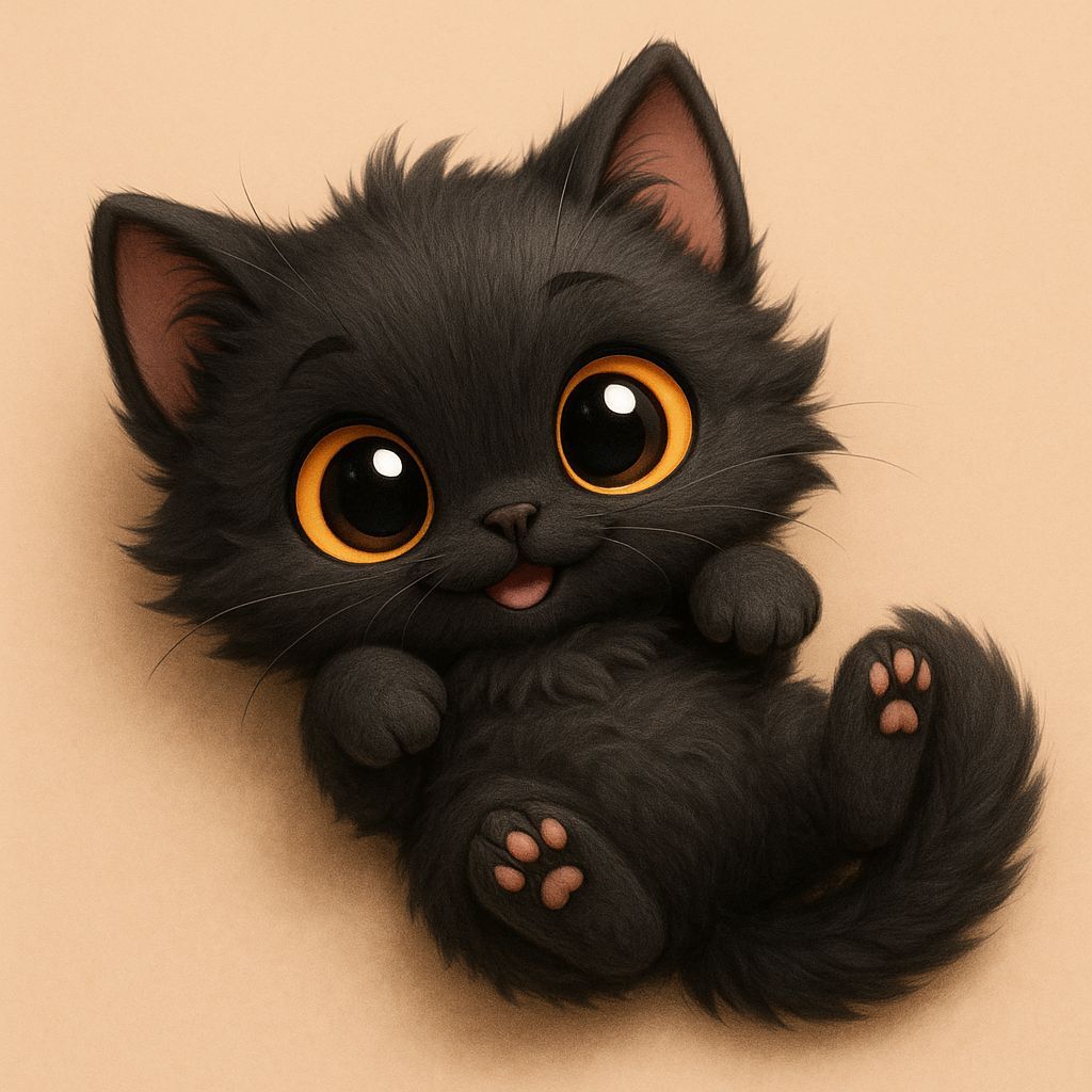 This image features a fluffy chibi black kitten with large orange eyes, playfully lying on its back. It's a detailed 3D render with an expressive face, perfect for decor.
