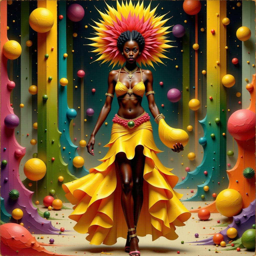 This image depicts Josephine Baker, the famous cabaret dancer and spy, in her iconic fruit-wearing costume. A digital artwork capturing her beauty and intelligence during World War II.