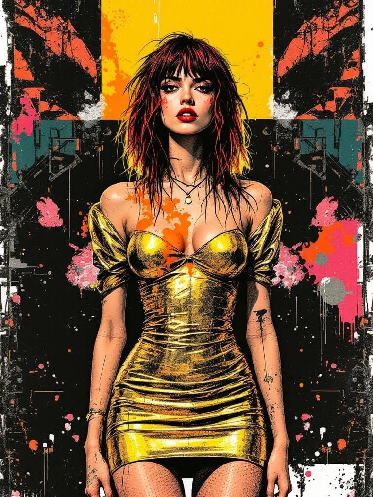 A striking picture of a Swedish pin-up woman in a metallic sundress. This image uses varied crosshatching and high-contrast photocopier textures to capture a raw, rebellious energy in a zine aesthetic.