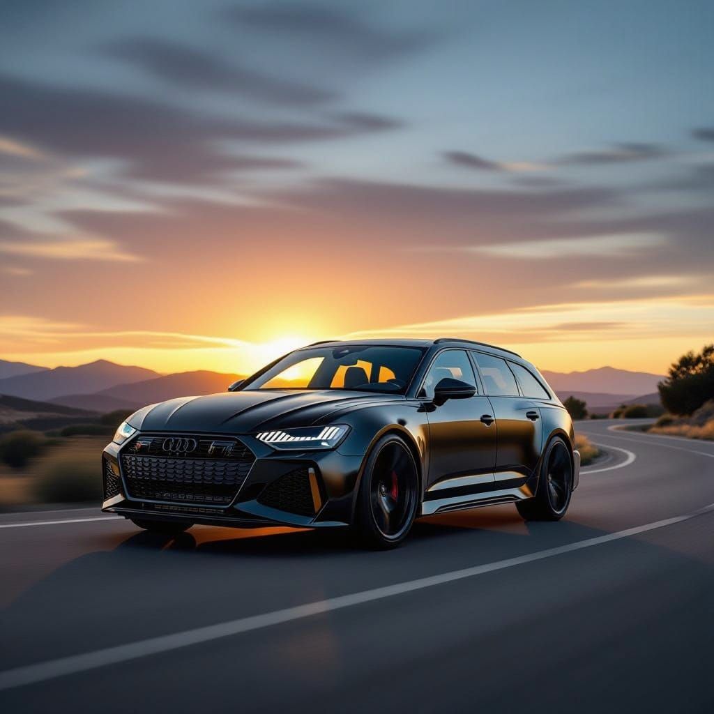 A stunning photograph of a matte black Audi RS6 wagon accelerating down a deserted road, captured with a shallow depth of field and pronounced bokeh effect, showcasing the car's sleek lines in warm sunset light.