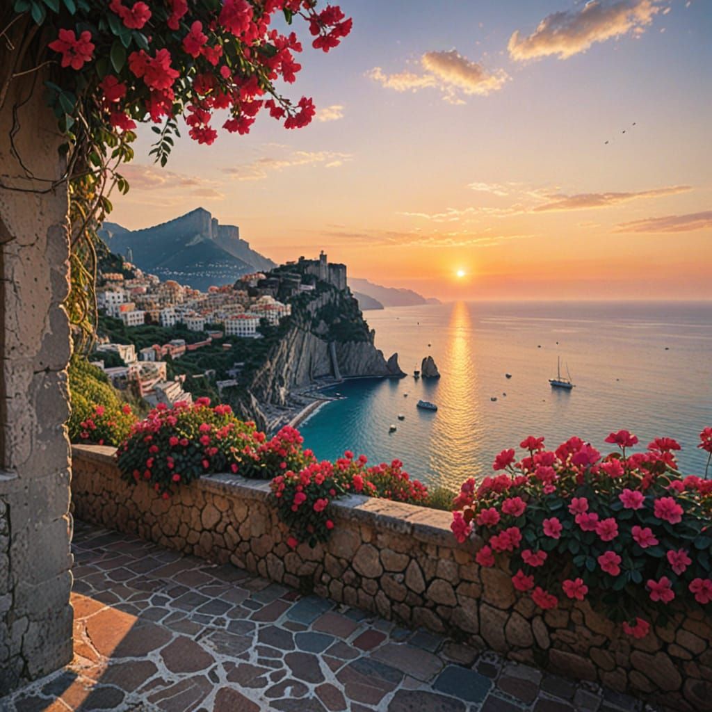 Easily generate stunning Amalfi Coast sunset images with AI. Explore beautiful Italian coastlines and dramatic rock formations.