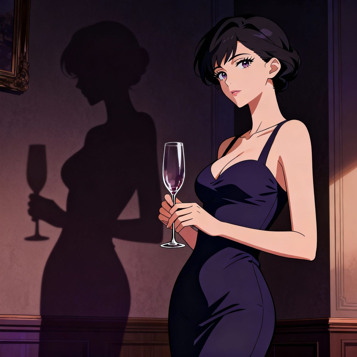 A striking image of a woman's shadow in a dimly lit room, highlighting graceful curves and poise. Rendered in a Manga Scan style with deep colors and cinematic lighting, evoking sophistication.