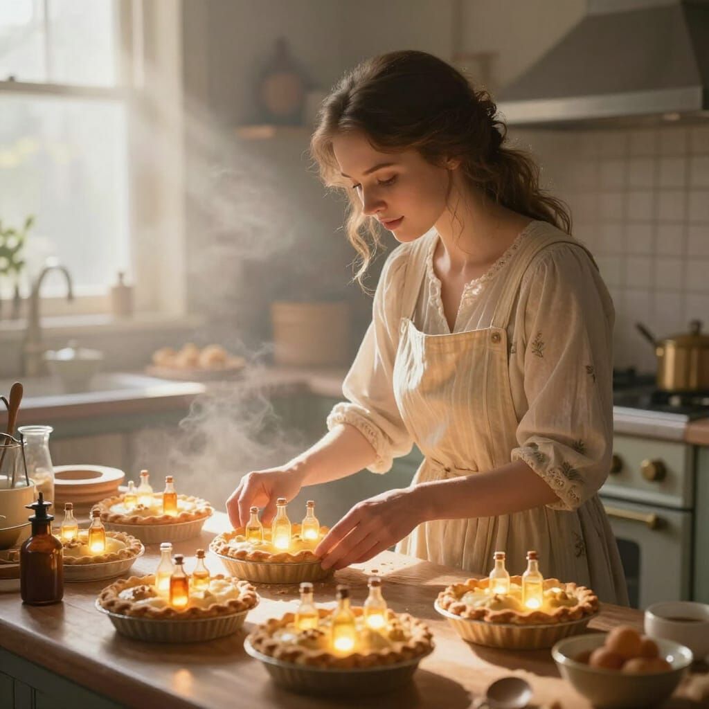 This image shows a mother crafting pies filled with glowing bottles in a hyperdetailed, misty kitchen. The scene is rendered with soft, luminous light in a style reminiscent of Kinkade's detailed, glowing aesthetic.