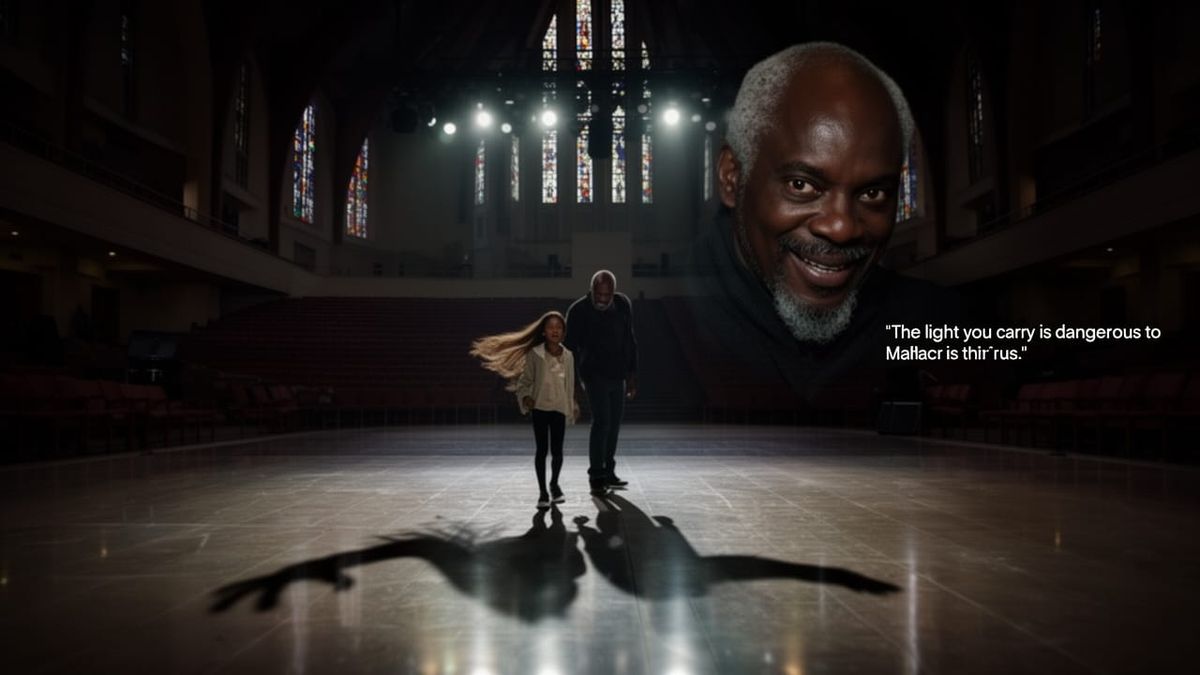 “Empty African city megachurch auditorium at evening, polished floor reflecting dim stage lights, teenage Chinaza (18, light brown skin, long flowing hair) standing in fear as echoing footsteps approach, African Pastor Malachai (48, dark brown skin, balding with gray temples) emerging from shadows, cold sinister smile, whispering: ‘The light you carry is dangerous to us,’ his shadow stretching unnaturally across the floor like a living creature reaching for her, cinematic dramatic lighting, ultra-realistic, high detail, suspenseful thriller style, emotional tension palpable, urban African city cathedral interior, foreboding and mystical atmosphere”
