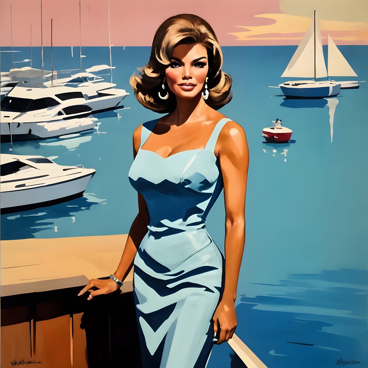 This image shows a vibrant impressionist painting of a marina in the South of France, with bold brush strokes and 3D textures. A stylish woman stands out in the foreground, inspired by the mod 1960s aesthetic, surrounded by moored boats and sailing vessels in the background, set against a warm sunset.