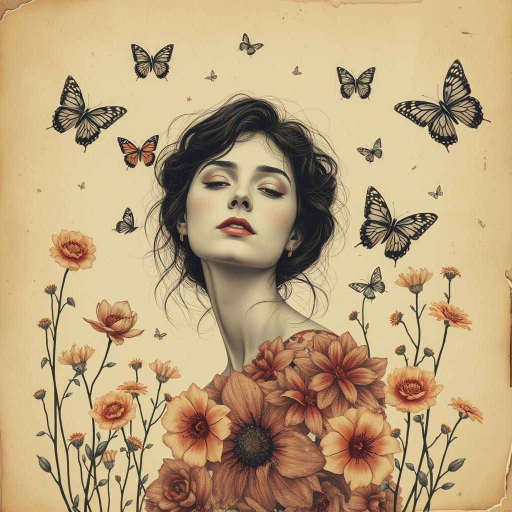 This image shows a woman amidst flowers and butterflies, set against an old paper texture. The artwork features warm sepia tones and a layered artistic composition, reminiscent of vintage collage art.