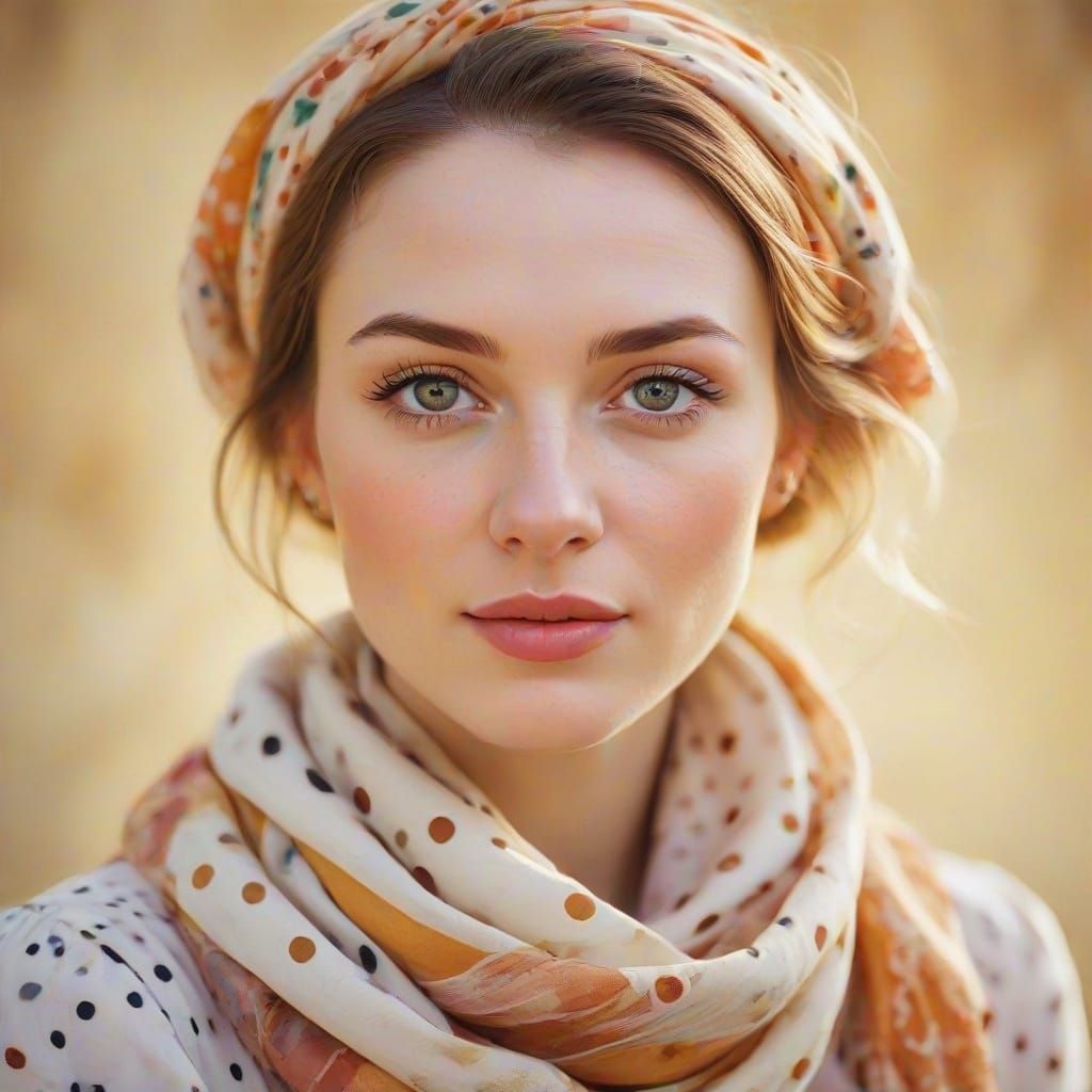 A watercolor portrait of a woman in a polka dot dress and scarf. The artwork features soft focus, whimsical brushstrokes, delicate skin tones, and a pastel background with warm golden lighting.