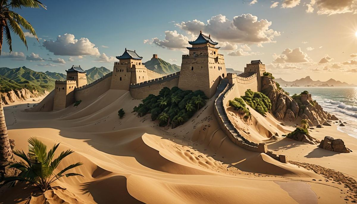 This breathtaking image depicts a serene tropical paradise with the Great Wall of China recreated as a majestic sandcastle on a stunning beach. Soft sunlight casts long shadows across the sand as palm trees sway gently in the breeze, and the sound of waves crashing in the background creates a peaceful at...