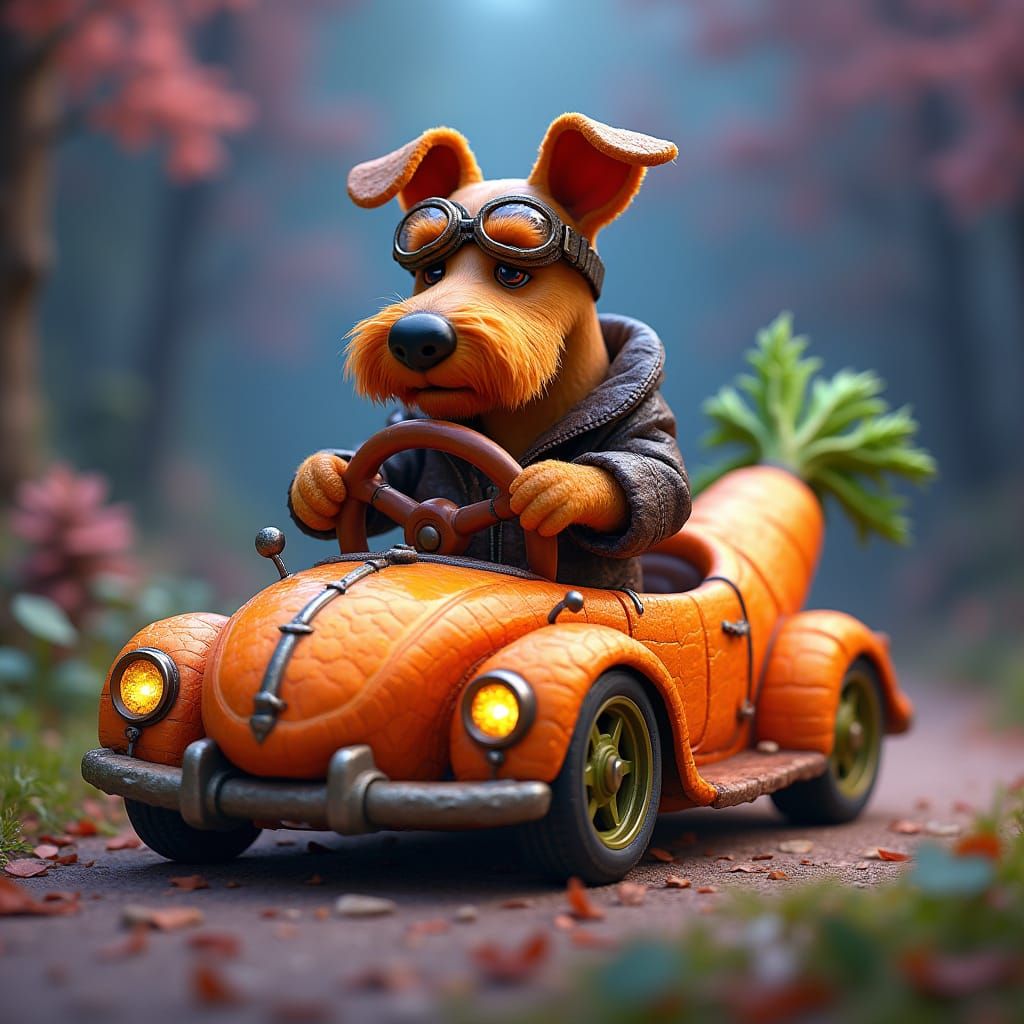 This image shows a vibrant Airedale terrier driving a fantastical car crafted from juicy carrots, set against a dreamlike landscape with intricate details and textures, evoking a sense of wonder and enchantment in a highly detailed, matte painting style