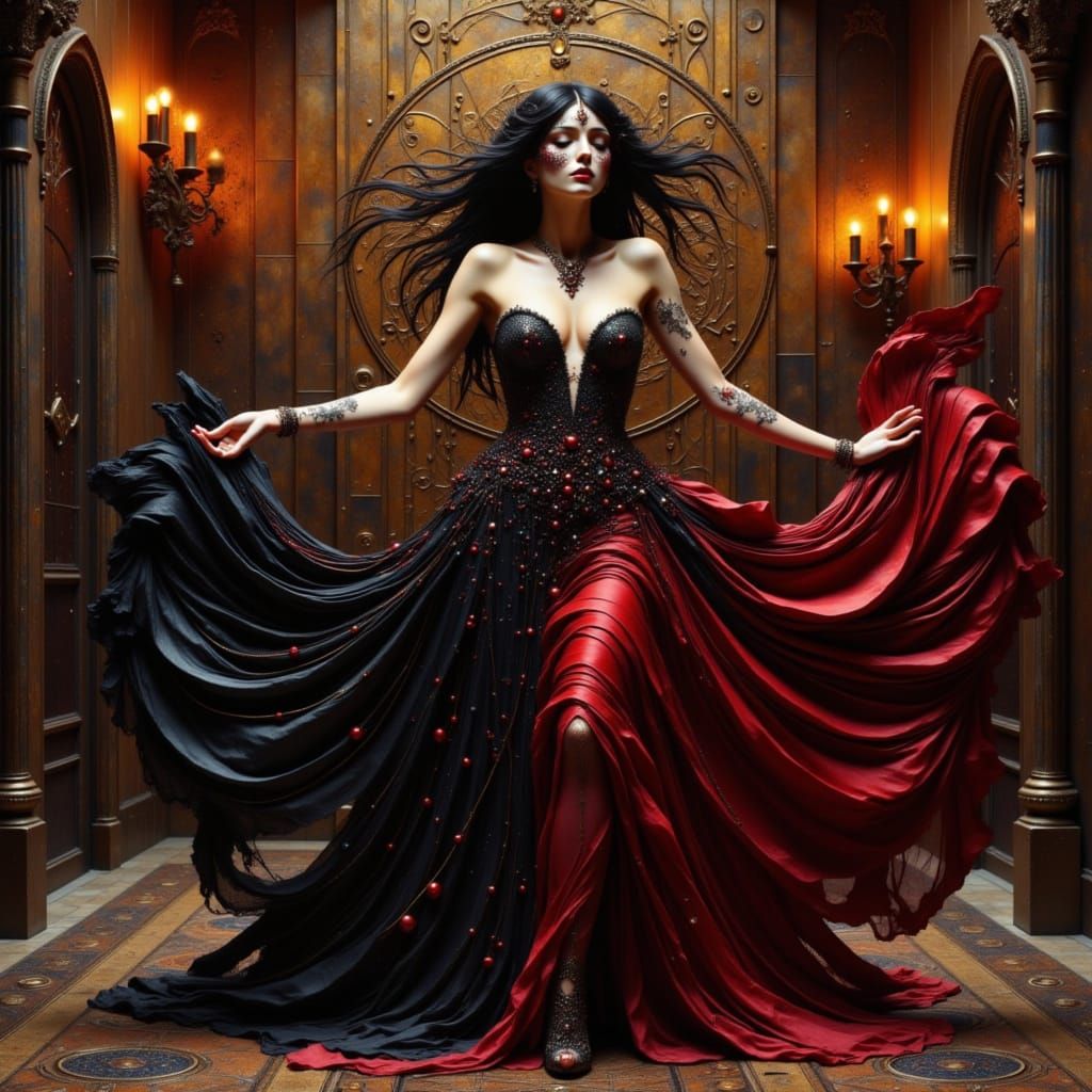 This image shows a captivating dancer in a medieval tavern setting, surrounded by a rowdy crowd. The dancer's flowing black and red silk attire shines in the dim light, evoking a sense of mystery and allure.