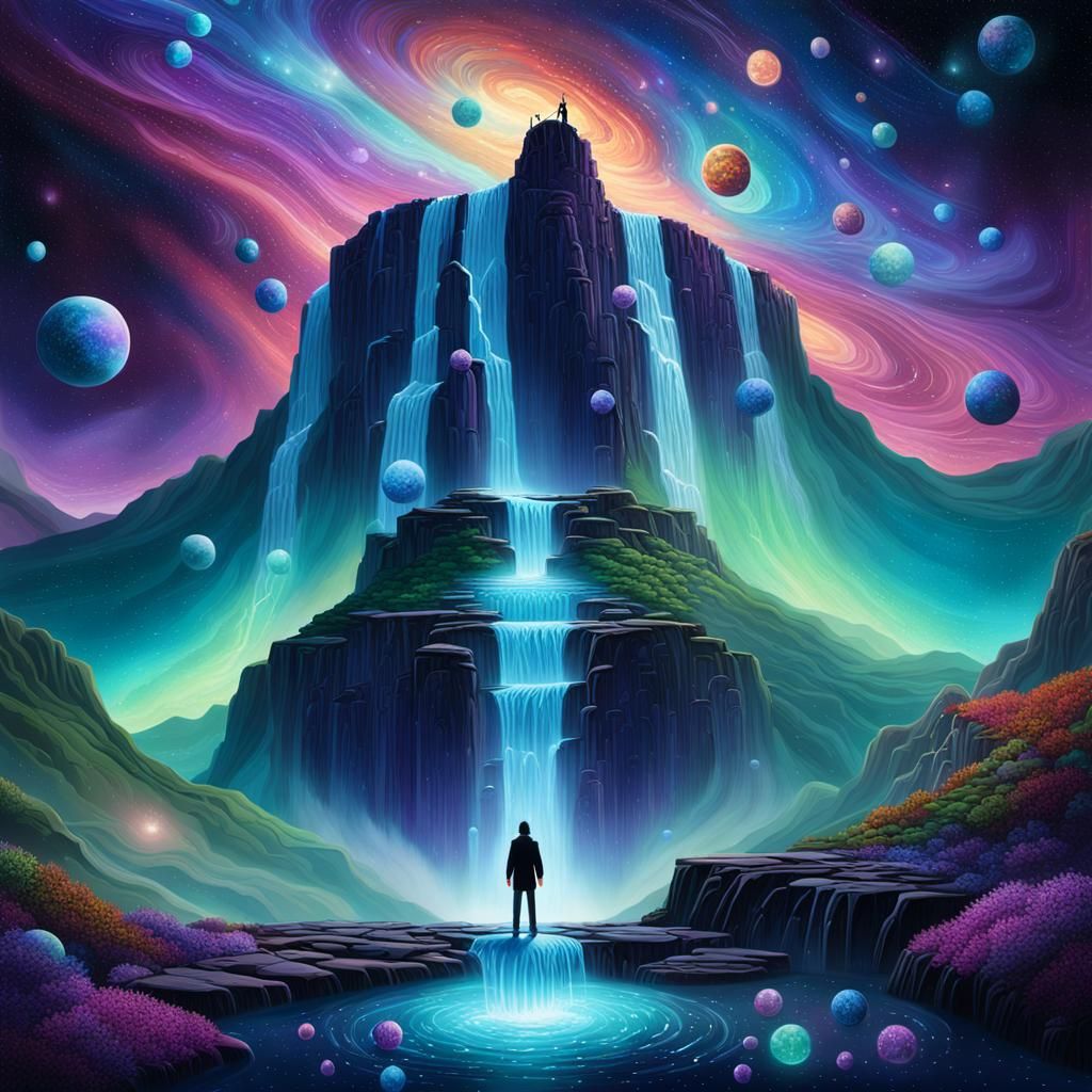 A surreal image shows a person silhouetted against a cosmic waterfall. Galaxies and stars cascade from a floating mountain into an endless void, illuminated by glowing flora and swirling nebulae in a dreamlike vista.