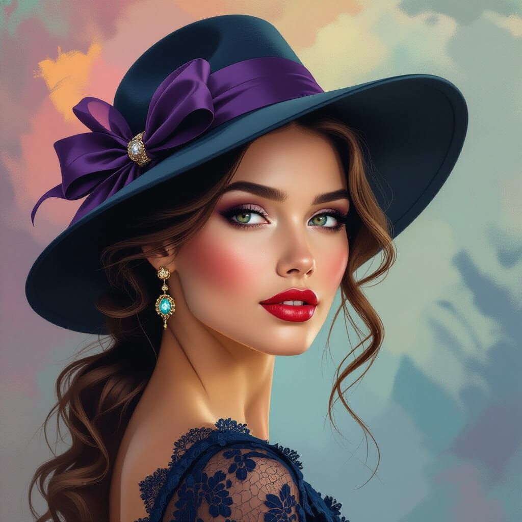 A striking picture of a beautiful woman wearing a hat. The portrait features hyperrealistic details and dramatic lighting in a splash art style that evokes a sense of freedom and fashion.